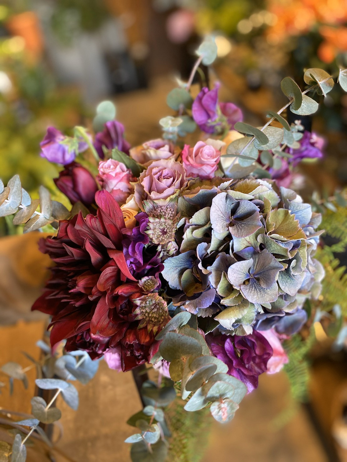カクテルブーケには秋色アジサイ、ダリア、紫の薔薇を使い大人ぽっくシックばブーケに仕上げました。