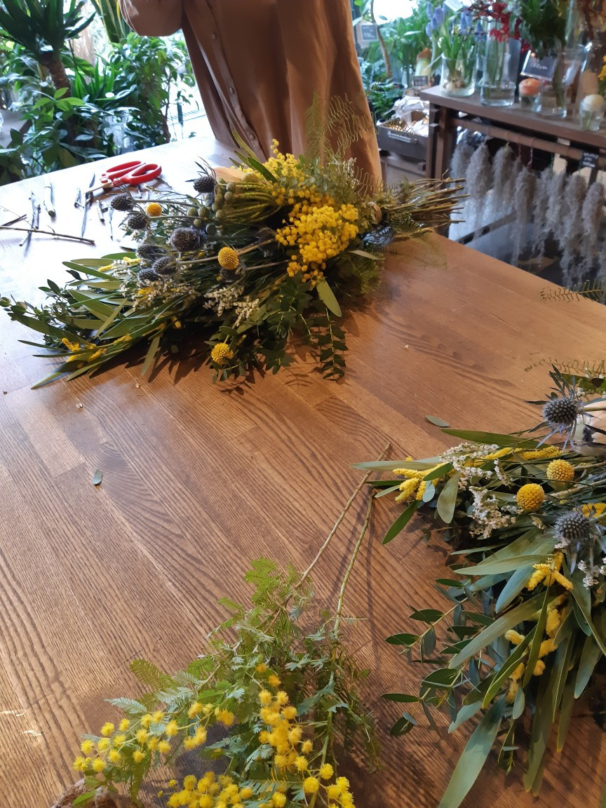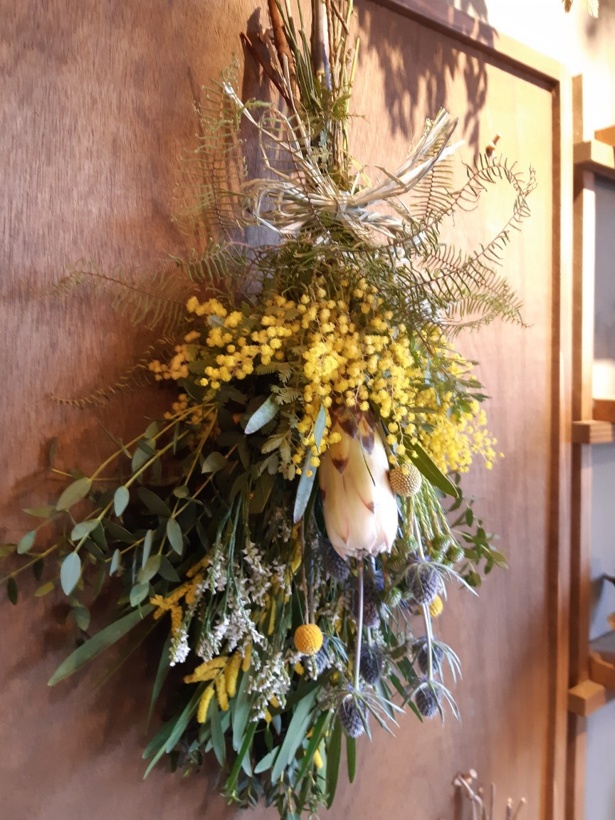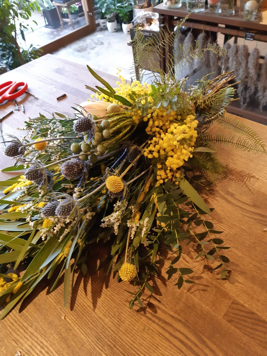 本日のワークショップはミモザのスワッグを作りました。