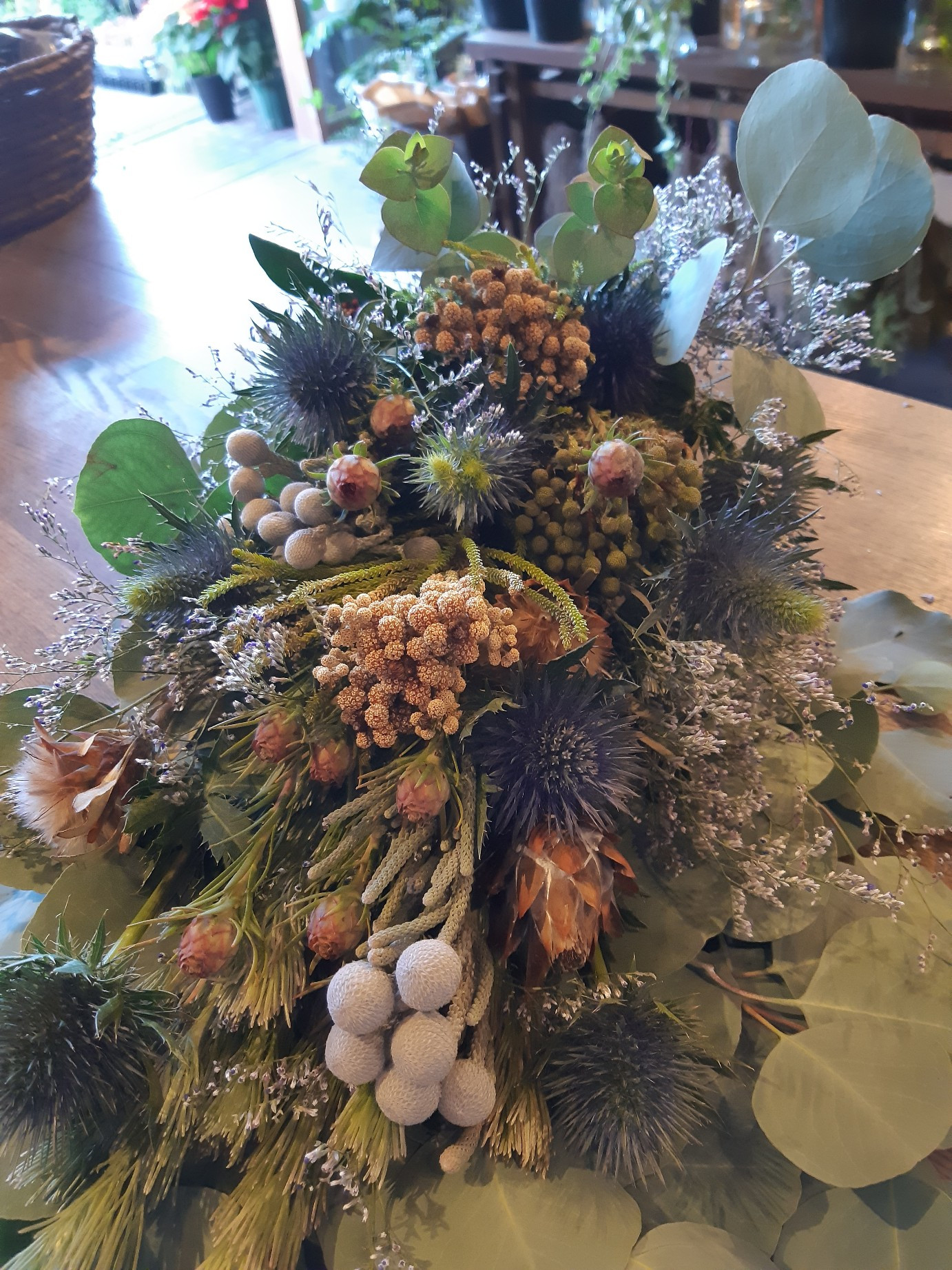 スワッグを頼むなら大阪の旭区にある花屋|結いはなで 2020/12/06 お母さんの誕生日に お母さんの誕生日プレゼントにスワッグのご注文いただきました。 紫の色のエリンジュームを入れて、グリーンと実でナチュラルなスワッグに仕上げました。 大阪でスワッグを頼むなら旭区にある花屋|結いはなにお気軽にお問い合わせください。