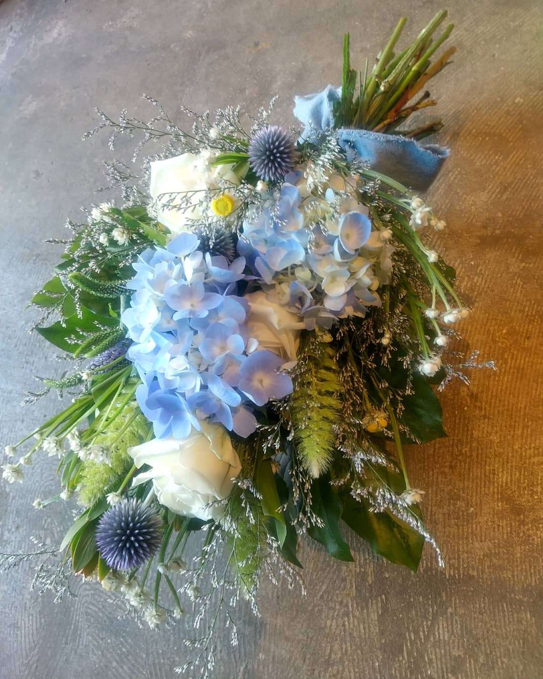撮影用の花を頼むなら大阪の旭区にある花屋_結いはなで 2021/06/27 撮影用のブーケ 撮影用のブーケ 黄色いワンピースの服を着るので 花はブルーのアジサイを入れた爽やかなブーケに 撮影が終わったブーケは後でスワッグにして飾っていただけます。 ]