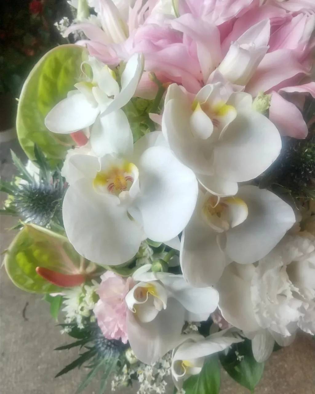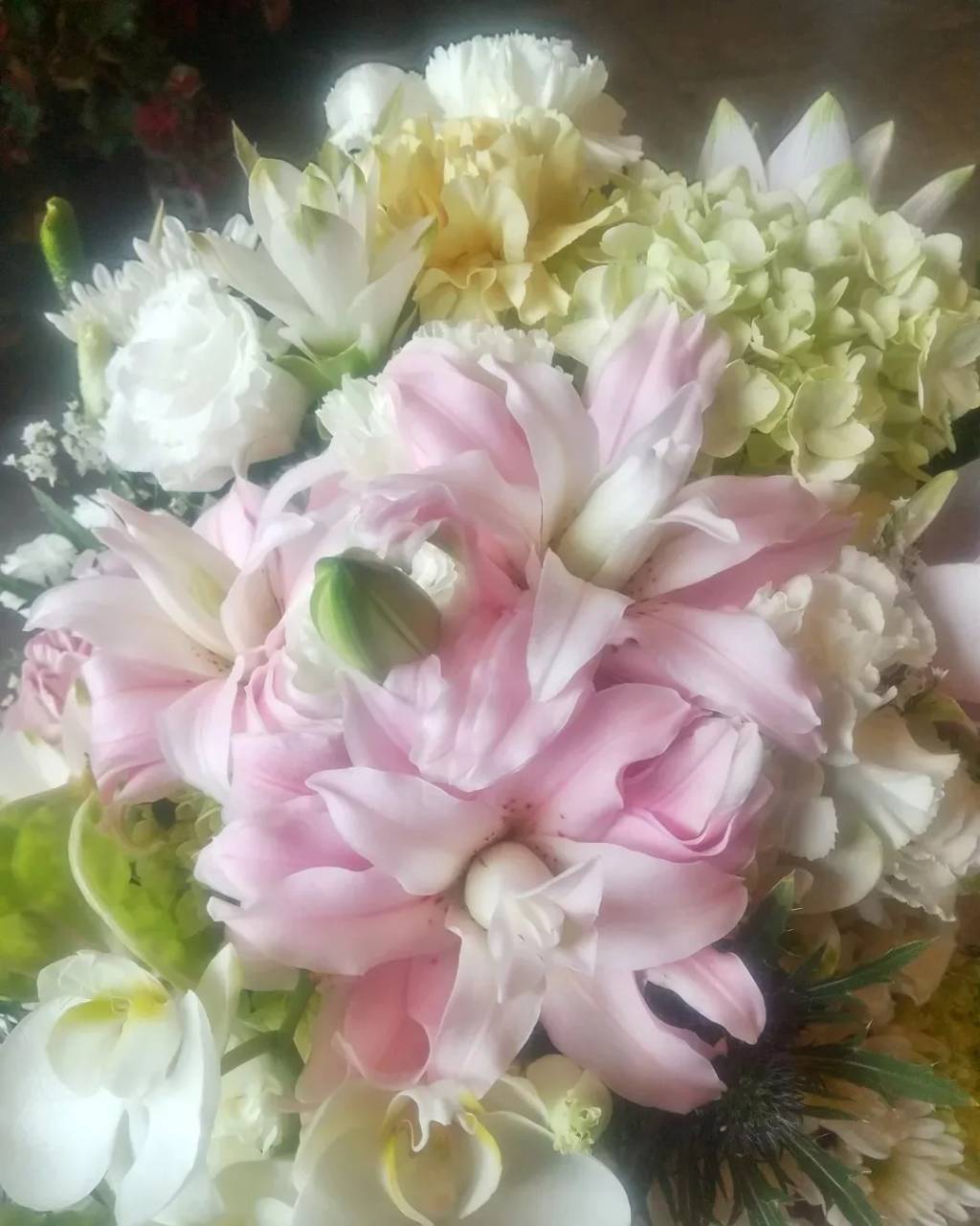 ピンクの八重咲のユリと胡蝶蘭を入れた