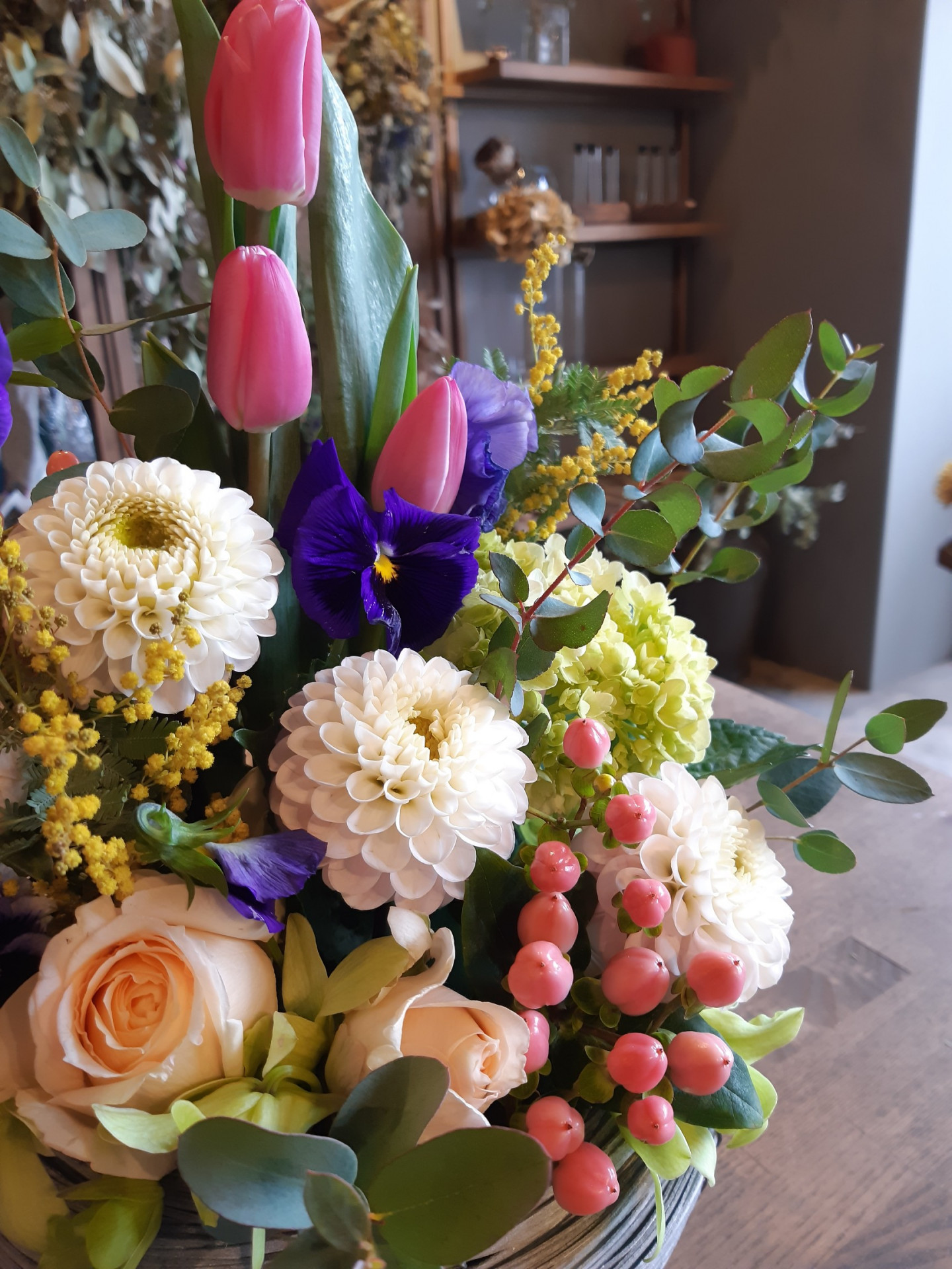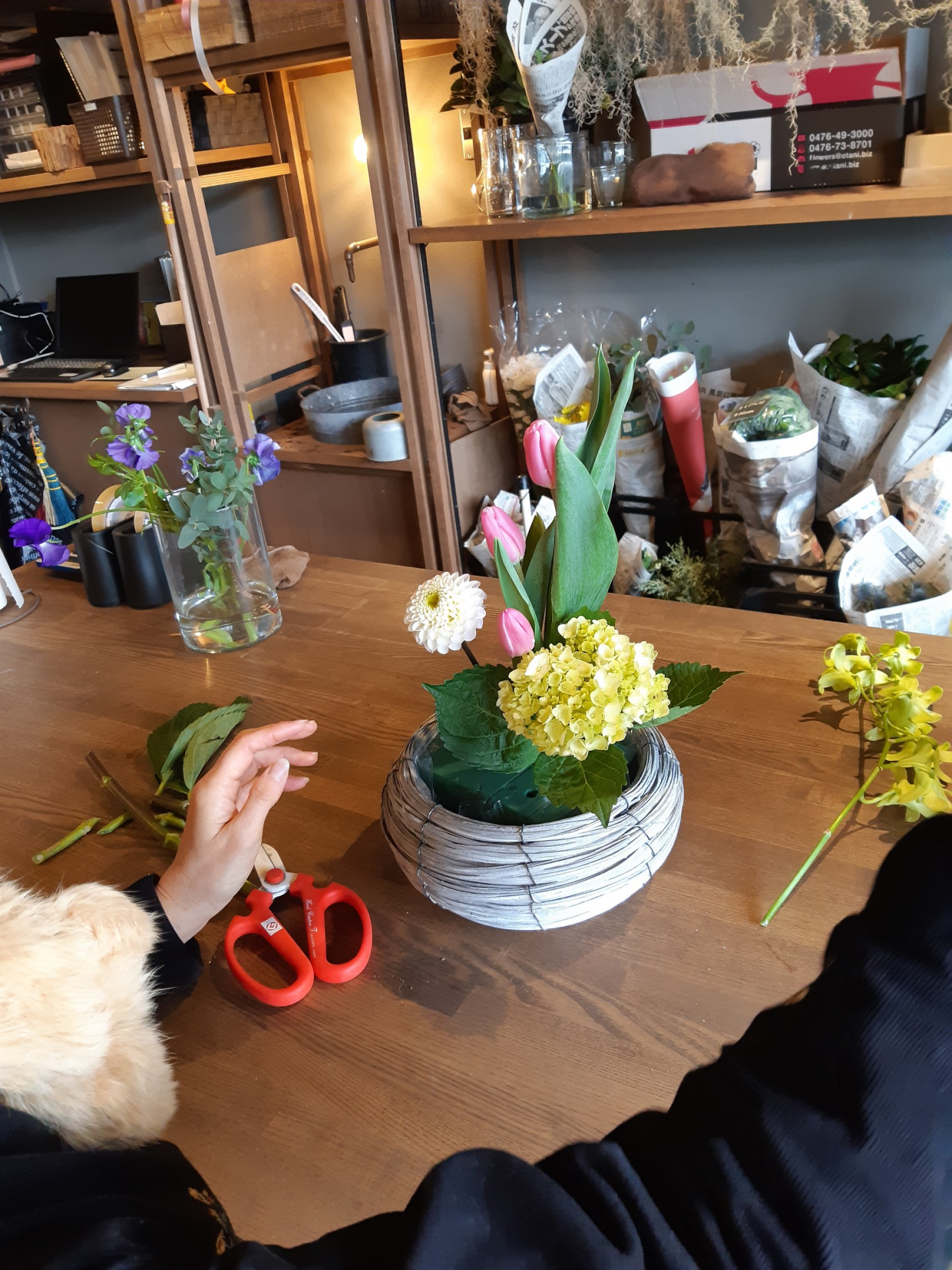 お教室でのレッスンと違い、素敵なお花屋さんで、色とりどりのお花に囲まれてのワークショップは日常を忘れ楽しい時間でした。
